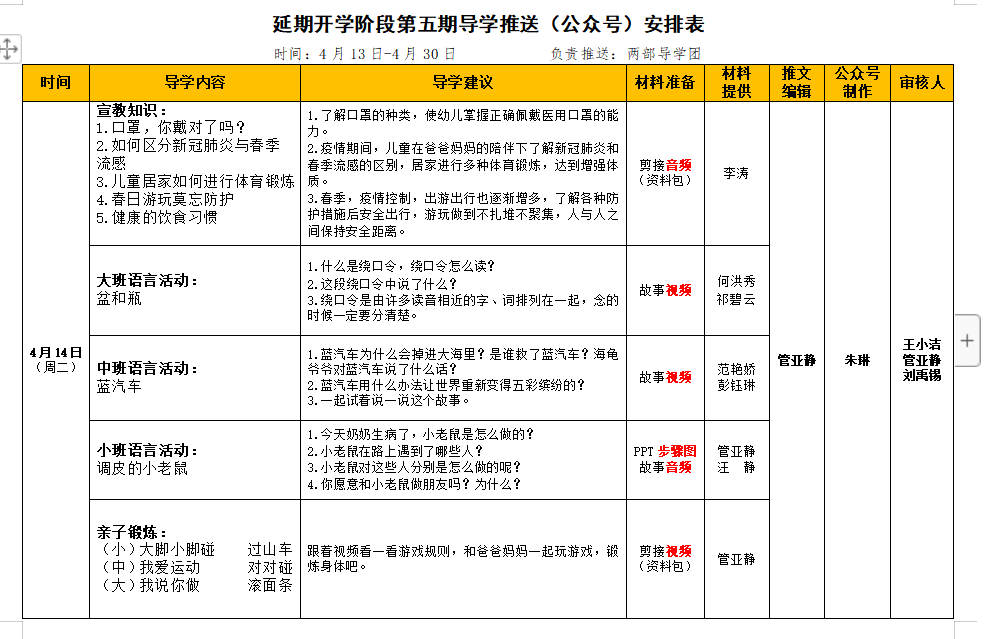 课程审议督导周期计划制:完善了三年、学年、学期课程审议计划,通过长期和短期规划进行定期督导,通过观摩、研讨、反思等进行调整实践,呈现不同阶段中各教研组教师成长、幼儿学习实效、课程生发实施的真实情况,让每周的教研活动有主题、有规划。