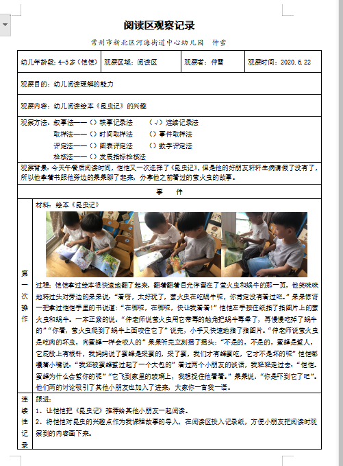 问题1.如何观察记录幼儿在园内的各类行为活动,如来园离园、一日活动安排表、区域游戏(室内、户外)等。 2.解读课程游戏化六个支架,结合实践活动认真实施。 教研时间:2019.9-2020.8 教研目标: 1. 细读课程游戏化六个支架 支架1:观察1名儿童,每天观察3次,每次3分钟,自己用随笔(最好是白描)方式记录。 支架2:学习《3-6岁儿童学习与发展指南》 支架3:改变活动室内小学化的课桌椅摆布方式。 支架4:尝试一餐两点由儿童自主完成,老师只是自助餐的服务生之一。 支架5:每所幼儿园收集园所附近一定范围之内的各类自然资源、社会资源和人力资源(机构、基地、材料、有专长的人员等),形成本幼儿园的教育资源地图。 支架6:尝试实行弹性一日活动时间安排表,除了餐点和午休时间,其他时间允许老师根据活动需要,灵活调配。 2. 围绕“三个一”课程从社区资源、班级材料整理课程、户外植物资源的课程研讨撰写小微课程故事。 3. 结合案例开展《指南》解读。 教研过程: 一、通过支架1——通过发现儿童,认识儿童,形成正确的儿童观。 支架1:观察1名儿童,每天观察3次,每次3分钟,自己用随笔(最好是白描)方式记录,同事们之间以即兴谈话或沙龙方式高频度讨论自己观察到的儿童行为(也可以正式讨论),坚持做1-2个月。要求:发现儿童的兴趣点和能力,而不是去发现问题,也不需要提供帮助,学习做一个忠实的记录者和积极的赞美者。提示:户外游戏更容易观察。 (一)为什么是不超过三分钟的观察 (二)为什么要观察三次? (三)为什么高频率讨论对幼儿的观察 (四)为什么建议在户外自由活动中观察幼儿 通过对支架1的解读,从一日活动出发进行观察记录分享学习,小中大班研讨确定了3个观察点。小班:以幼儿独自准时入园进行连续性跟踪观察;中班:室内区域游戏材料的投放与引导策略进行连续性跟踪观察;大班:户外活动场地的摆放与调整进行研究型连续观察。