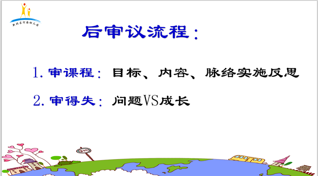 整队园本教研活动中的活动审议要明确前中后审议的要点和策略,对资源的盘点和对接、社会资源到教育资源的转换、区域活动的幼儿活动表征等,还需要研究与现有课程的融合度,审议审什么还不清晰。策略: