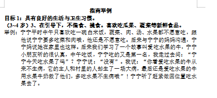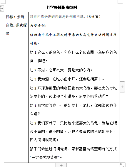 互评互学互思 年级组长、教研组长进行观察记录点评修改,让老师们学会抓住观察视角,学会用心观察,知道观察记录的意义,明确观察目标。点对点评价,面对面辐射,结合教学常规检查让老师活学活用。 二、通过支架2——让《指南》成为幼儿教师的“圣经” 支架2:学习《3-6岁儿童学习与发展指南》,结合自己的观察经历与教育经验,对于每一条目标都举出3个案例。要求:不要死记硬背指南内容,不提倡要求老师书写案例,以口头交流或者QQ群交流分享为主要形式。对于每一条目标如果能够举出6个案例的,属于熟练掌握指南。 (一)如何学习《指南》、用好《指南》 (二)如何运用《指南》全面、积极、客观地评价幼儿 (三)如何用《指南》提升教师的观察能力 深入解读《指南》一二级目标,老师结合实际案例进行《指南》举例,实实在在做好解读工作。