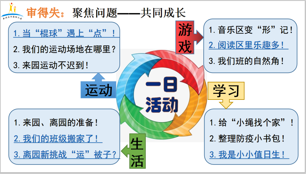 2.计划落到实处,研讨主题聚焦上一周幼儿活动中呈现的共性和个性的资源,在同话题教研、个案共享中提升同一话题的研讨能力。