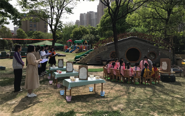 活动中,大家首先走进户外种植区进行观摩。种植区是幼儿与大自然亲密接触的宝贵资源,它不仅为幼儿提供了随机观察、探索、管理的机会,能够让幼儿接触自然,关注植物,感受生命的生长,还可以培养幼儿的责任心及热爱劳动的美好情感。课题组组长周婷玉老师带领全体成员观摩了国宾幼儿园的户外种植园地,并介绍了孩子们平时如何进行种植体验,老师需要提供怎样的环境支持等。接着,沈婕老师带来了一节小班美术《花园变漂亮了》活动课,沈老师聚焦户外课堂,将劳动教育与美育相融合,新颖的教学形式让大家耳目一新,深受启发。
