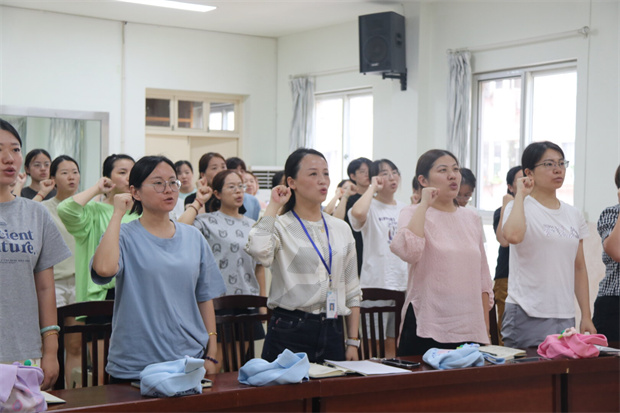 在刘佳老师满怀激情与自豪的引领下,全体教工面容严肃而庄重,整齐站立,共同举起右手,以铿锵有力的声音,一字一句地宣读着那神圣而庄严的教师誓言。