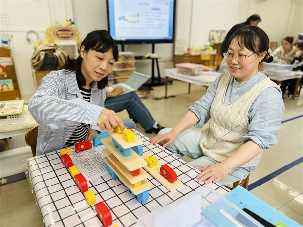 进入实操环节。教师们分组进行,亲身体验各种游戏材料的操作与使用。在角色区,教师们扮演起小厨师,亲手制作“美食”;在美术区,大家动手创作,利用创意乐园的材料发挥想象;数学区的串珠天地和大象家族更是引发了教师们对如何寓教于乐、在游戏中学习数学知识的热烈讨论。此外,环创材料的展示也让教师们对如何营造温馨、有序的游戏环境有了新的灵感。