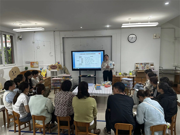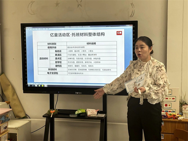 培训活动在幼儿午睡后准时开始,首先由主持人详细介绍了亿童活动区托班材料的整体结构,包括使用手册、活动材料、环创材料及电子资源包等多个方面。活动材料覆盖了角色区、表演区、美术区、数学区、建构区等多个功能区,如小厨师、面点师等角色扮演材料,以及打击乐器包、生活小舞台等表演道具,为孩子们提供了丰富的游戏选择。每一种材料都设计得既富有教育意义,又充满趣味性,旨在促进幼儿全面发展。