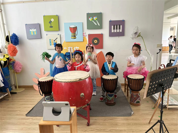 黄娇老师开放班级音乐区活动展示,区域内使用手机、平板,NFC、话筒及音响等材料。将传统音乐游戏编码为NFC标签贴于塑料框,幼儿通过手机/iPad感应即可激活对应游戏。临时搭建系统包含移动音响、无线话筒及备用投影设备(因效果欠佳改用移动终端),后续也将继续探索数智化在音乐区的应用。