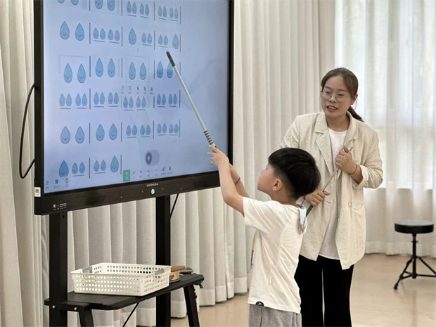 吴正干老师用希沃白板开展了音乐活动《大雨小雨》,这次活动主要在于给与孩子音乐的认知,以《大雨哗啦啦,小雨淅沥沥》为载体,通过动态图谱直观呈现大雨强拍与小雨连贯弱拍的节奏差异,引导幼儿视听结合感知强弱对比。针对幼儿注意力特点,仅保留歌词关键句作为动态填空区,其余段落固定节奏型。教学中融入音乐会情境,借助希沃游戏操作图谱、打击乐器演奏,帮助幼儿在互动中具象理解音符时值,初步建立“大雨滴-四分音符”“小雨滴-八分音符”的符号认知。