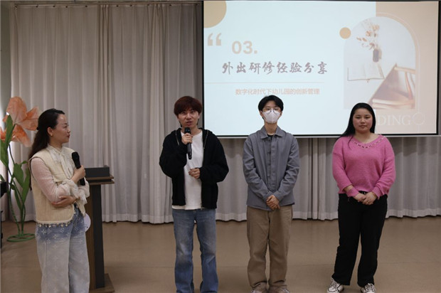河海幼儿园园长万洁分享了深圳研修所得,重点解析数字化背景下幼儿园创新管理策略,通过典型案例展示园所环境规划、特色游戏开发及空间利用的先进经验。与会教师现场交流了"环境即课程"的实践感悟,就户外自主游戏设计、特色活动开发等形成新的实施路径。