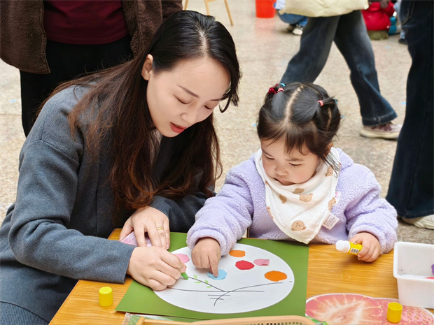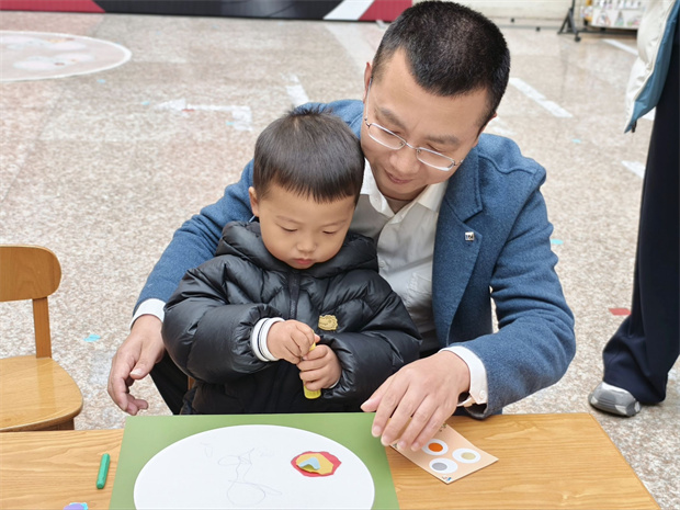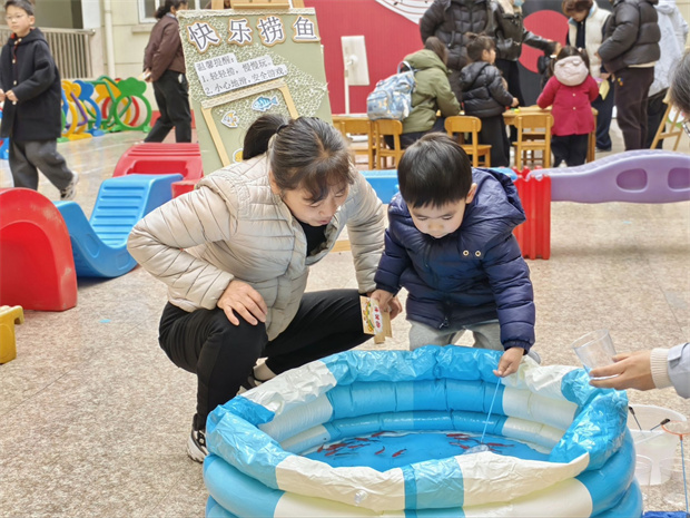 轻快的音乐声中,亲子游戏体验区热闹非凡。孩子在音乐互动区随节奏拍手摇摆,在欢快乐章中开启音乐感知启蒙,建立对节奏的敏锐感知;亲子阅读角中,家长与孩子依偎共读,绘本故事丰富孩子词汇、提升语言组织能力,还让孩子沉浸书中提升专注力;闯关挑战区传来阵阵加油鼓励,小手拉大手跨越挑战,孩子在攀爬跳跃中提升感统协调、促进大运动发展;快乐捞鱼区笑声不断,孩子手持小网专注捞鱼,精准控制手部动作提升了手眼协调与精细动作;创意工坊区,亲子制作撕贴画“春天”,自由挥洒创意激发艺术创造力,挑选搭配色彩增强色彩感知。每完成一项体验,孩子们便兴奋地收集一枚印章。集章卡上的印记,记录着他们勇敢尝试的脚步,也见证着亲子间默契的陪伴。