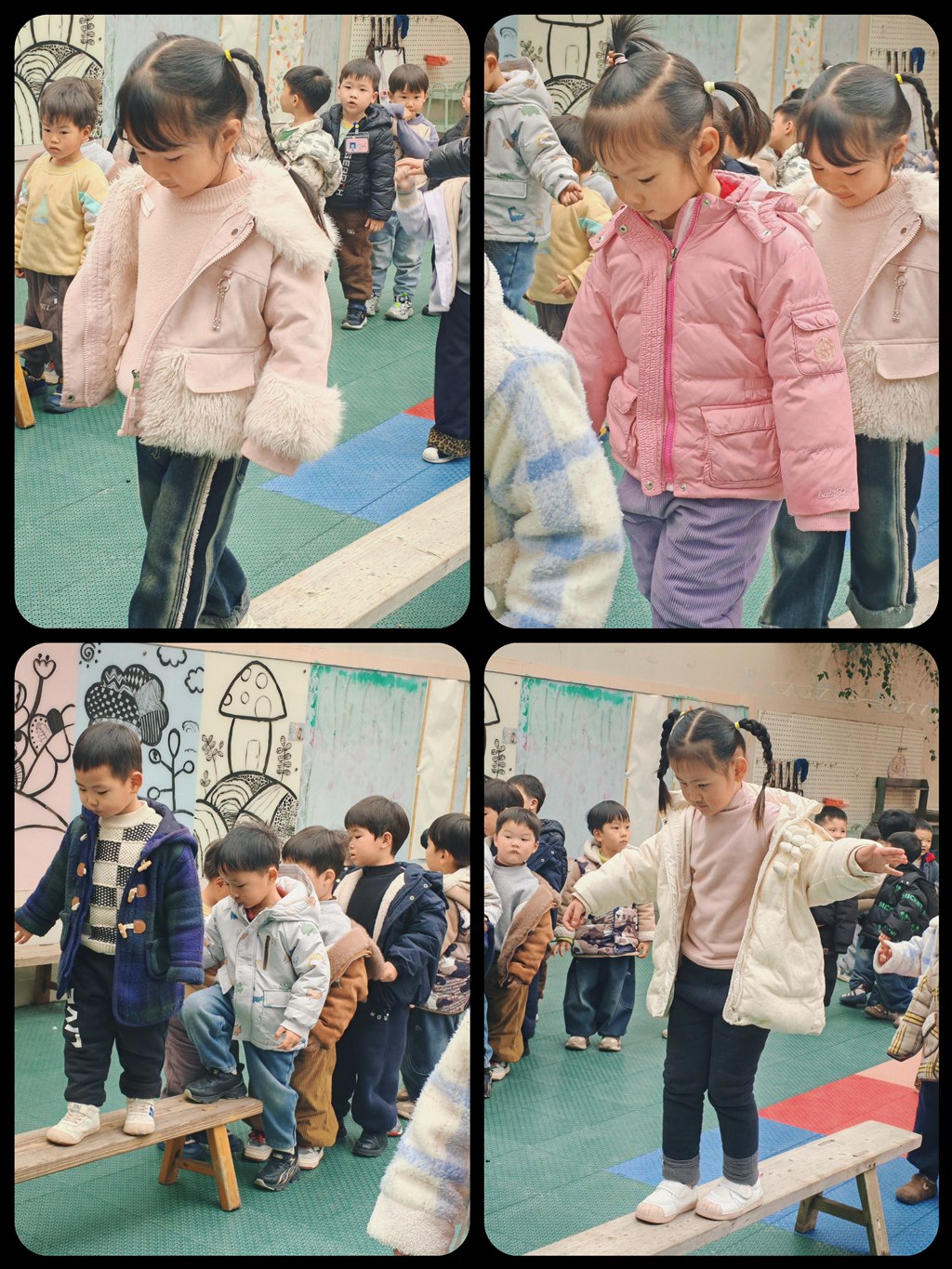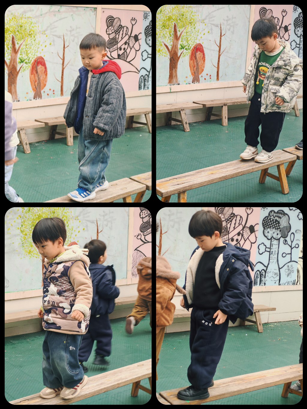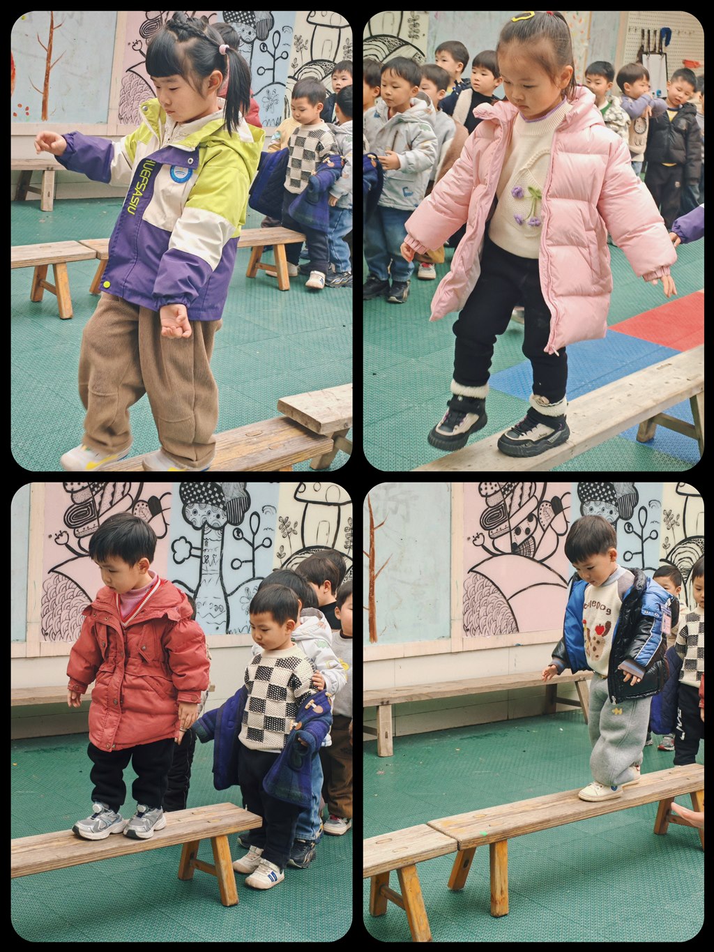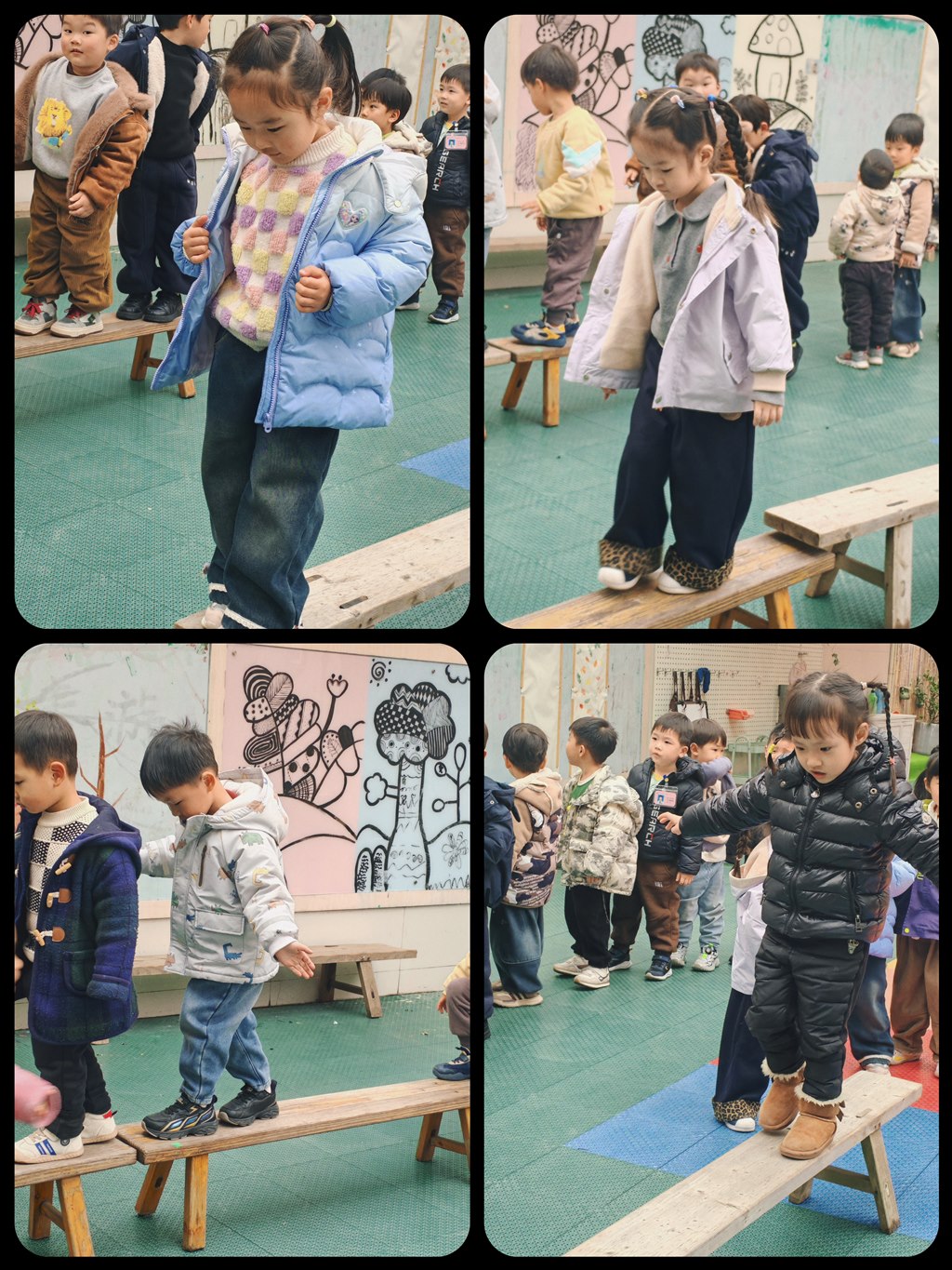 下午的阳光暖暖地洒在操场上☀️,宝贝们排着整整齐齐的小队伍,开启了有趣的平衡木挑战!